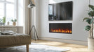 The Scion is a linear electric fireplace with a sophisticated design, including a modern, minimal front trim, no visible heater, and a built-in look with 16" tall glass for a stunning view. Your choice of crystal media or driftwood logs complements vibrant LED flames and customizable ember bed colors, creating a captivating ambiance that’s tailored to your interior design style. Available in 43 and 55-inch widths.